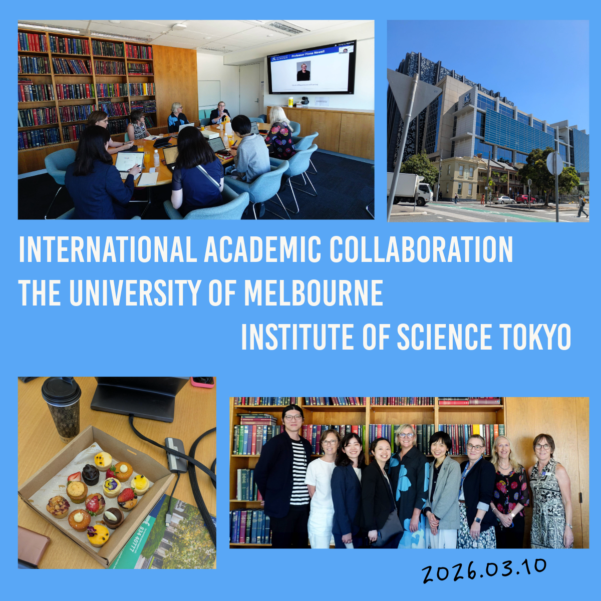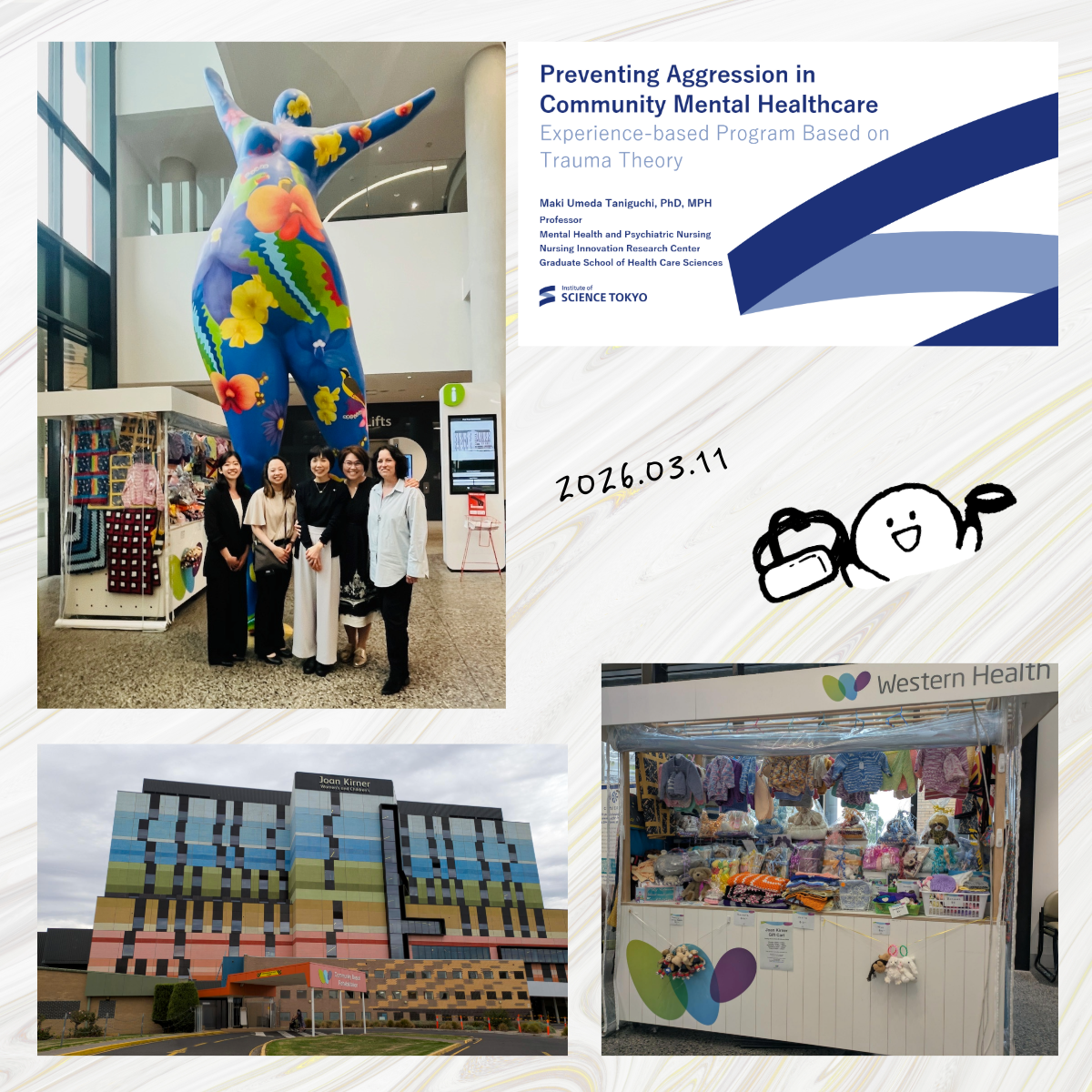 メルボルン大学看護学部 を訪問し、Newall看護学科長、Krishnasamy教授、Harrison教授、Jones准教授、Hamilton准教授らと意見交換を行いました。看護教育、研究体制について両大学の現状を共有し、臨床看護師の働き方や資格制度など違いはありつつも、臨床と大学の連携に心を砕く姿勢は共通していることを強く感じました。また、メルボルン大学看護学が実施している、Nursing Event Series 2026 をご紹介いただきました。オンライン開催もありますので、ご関心のある方はぜひご参加ください。