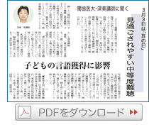 三五デシベルが聞こえれば、日常生活に支障はない。五〇デシベル以上になると、子どもでも補聴器をした方がいい。言葉の遅れがあるのは、両耳が難聴の場合で、片耳であれば遅れは起こらない。深美講師は「軽中度難聴は会話が可能なため、家族も難聴を疑わない。言葉が遅れぎみ、聞き返しが多い場合、様子を見ずに近くの耳鼻科を受診してほしい」と話している。