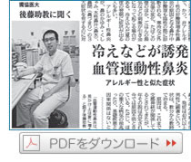 後藤助教は「血管運動性鼻炎の症例は、アレルギー性と比べて100人に1人いるかいないかの程度。季節を問わないが、見かけ上はクーラーを使う夏に増える。予防には、体を冷やさないなどの対策も大切だ」と話した。