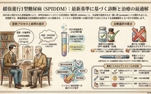 1. 症例背景(既往歴・経過) 2. 現症(身体所見・症状) 3. 検査所見 4. 臨床診断 この症例は、抗GAD抗体が陽性であるものの、最終観察時点での空腹時血清Cペプチドが0.6 ng/mL以上であり、内因性インスリ...