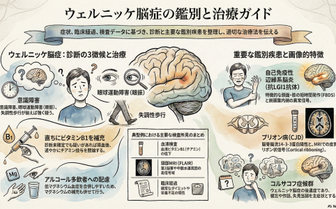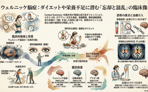 1. 症例の要約と診断 この症例は、3か月前からの極端なダイエットと1か月前からの食事摂取不良(数口のみ)という背景を持つ45歳の女性です。意識障害(JCS I-3)、眼球運動障害(失調性、注視時眼振)、および体幹・四肢...