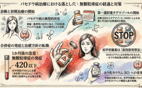 症状と臨床経過初期症状(5か月前?): 34歳の女性。眼痛、発汗、および動悸を自覚し、2か月前に症状が増悪したため来院しました。診断と初回治療(2か月前): 血液検査でTSHの低下、FT3・FT4の上昇、および抗TSH受...