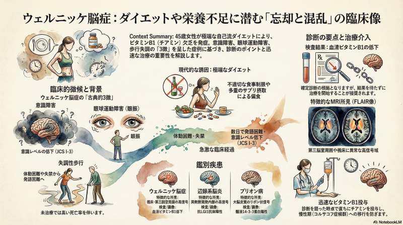 - 判断の根拠: 極端な食事制限(ダイエット)を背景としたビタミンB1欠乏によるもので、本疾患の典型的な3徴である**「意識障害」「眼球運動障害(眼振)」「失調」**をすべて満たしています。