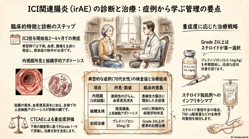 免疫関連腸炎は、適切な診断手順と迅速な治療介入により多くの症例で制御可能である。