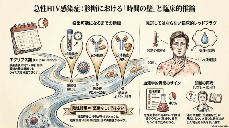 この資料は、薬物使用障害を持つ女性が下肢の慢性創傷や離脱症状の治療中に、急性HIV感染症と診断されるまでの過程を詳述した臨床症例報告です。入院当初のHIV検査は陰性でしたが、その後に現れた盗汗やリンパ節腫脹、白血球減少といった症状から、医師は初期の「ウィンドウ期」を疑い再検査を実施しました。結果として、核酸増幅検査(NAT)により非常に高いウイルス量が検出され、早期診断と治療の重要性が浮き彫りになっています。解説文では、HIV感染直後のエクリプス期における診断の難しさや、典型的な単核球症様症状の見極めについて専門的な見地から論じています。