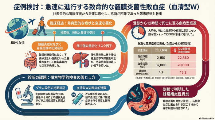 • 白血球数が正常範囲内(9720/μl)であったこと、また肝機能・腎機能が正常であったことは、典型的な急性化膿性細菌感染症(例:黄色ブドウ球菌による菌血症)の可能性を相対的に低くする要因となった。