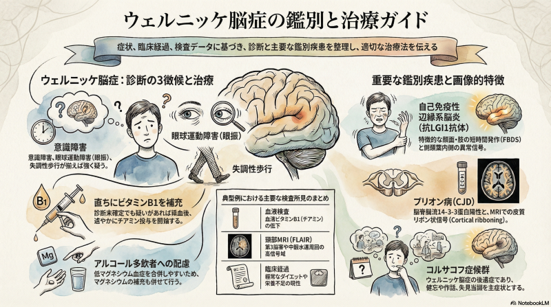 この症例は、3か月前からの極端なダイエットと1か月前からの食事摂取不良(数口のみ)という背景を持つ45歳の女性です。意識障害(JCS I-3)、眼球運動障害(失調性、注視時眼振)、および体幹・四肢の失調という「Wernicke脳症の3徴」が揃っています。頭部MRIのFLAIR像でも、中脳水管周囲や視床内側に異常高信号が認められ、ビタミンB1(チアミン)欠乏によるWernicke脳症と診断されます。