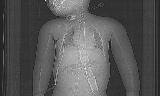 病歴)在胎37週5日、体重 2598g、Aps9 点(5分値)で出生。日齢3に高 T.bil 血症の為光線療法された以外に既往なし。日齢15の10時頃哺乳し、入眠したため布団に寝かせていた。布団をどかしたところ、鼻腔から泡沫状のものが出てきており、父に連絡後、救急要請、搬入時には心肺停止の状態。直ちに心肺蘇生開始。2クールで再開。以降は低酸素脳症の為自発呼吸はなく、日齢29日に気管切開施行。筋緊張が強く、換気不全が続くため、日齢29日からロクロニウムの持続投与を継続。以降は状態安定。平坦脳波、日齢 330 日から脳波活動が確認された。日齢616日、喉頭気管分離術、胃瘻造設術を実施。術中に異常なく終了。術後翌朝に頻脈となり、一旦改善したが、突然の心停止となった。1 度心拍再開したがまもなく心停止となり、その後 1 時間蘇生に反応せず、20○○ 年 ○ 月 14 日午前 8 時 47 分死亡した。死亡確認から約1時間50分でAi-CT撮影。