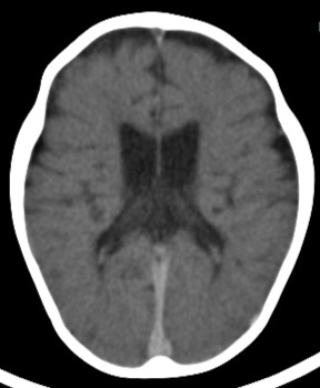 静脈洞、大脳鎌、小脳テント、側脳室内脈絡叢の高吸収化が目立ち、血液就下によるものと考える。