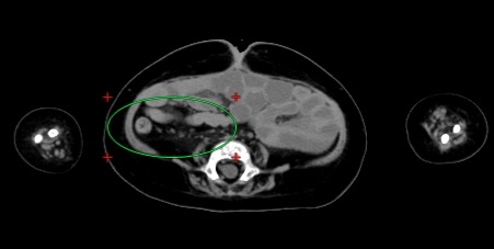 腹水はない。左前腹壁に少量の管腔外のガスがある同部の腹直筋が軽度腫大し、近傍に脂肪混濁があり、皮膚表面に軽度陥没があることから、胃瘻抜去後状態を示しているものか。
