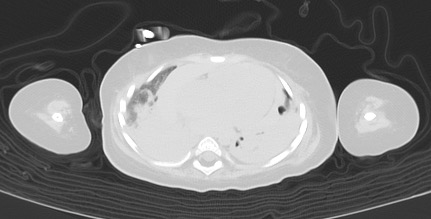 左胸腔の前方には嚢胞状に変化した肺と限局性気管支拡張があり、少量の気胸があるようにも見える。barotrauma、biotrauma 等による 肺の嚢胞性変化が存在していたのではないかと思われ、また空気漏出が起こっていたことが推測される。