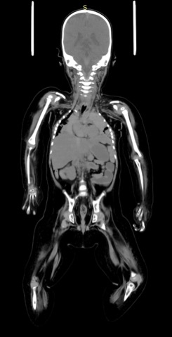 (以下、AiCT)頭部は全身に比して小さい。 全身は軟部組織腫大の印象を受けるが、各部のバランスには異常を感じない。 筋は萎縮している。骨は細く slender bone の印象を受けるが、印象としては不動化による二次的なものとして納得できる程度と思われる。