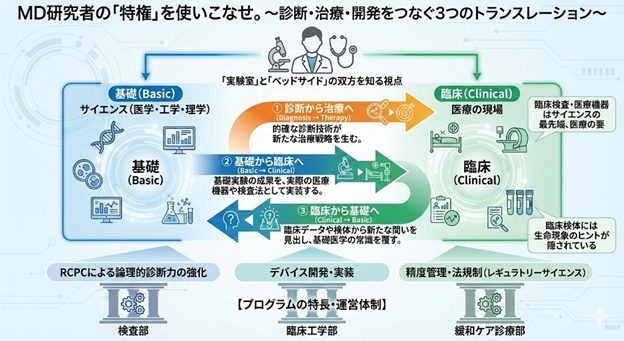 臨床検査や医療機器は、単なる「ツール」ではありません。それは、サイエンス(医学・工学・理学)の最先端が凝縮された領域であり、診断と治療をつなぐ医療の要です。そして何より、臨床検体には、まだ誰も知らない生命現象のヒントが隠されています。本コースでは、以下の「3つのTranslation」を軸に、MD研究者だからこそ可能な研究のアプローチを学びます。